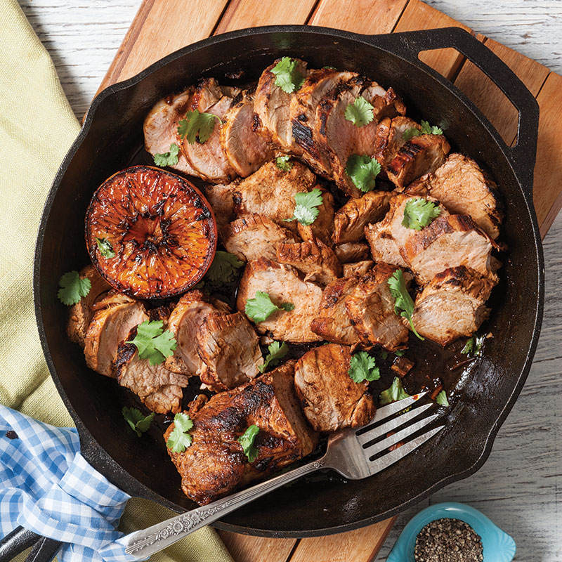 Chipotle salsa and charred orange give this grilled skillet tenderloin smoky flavor.
