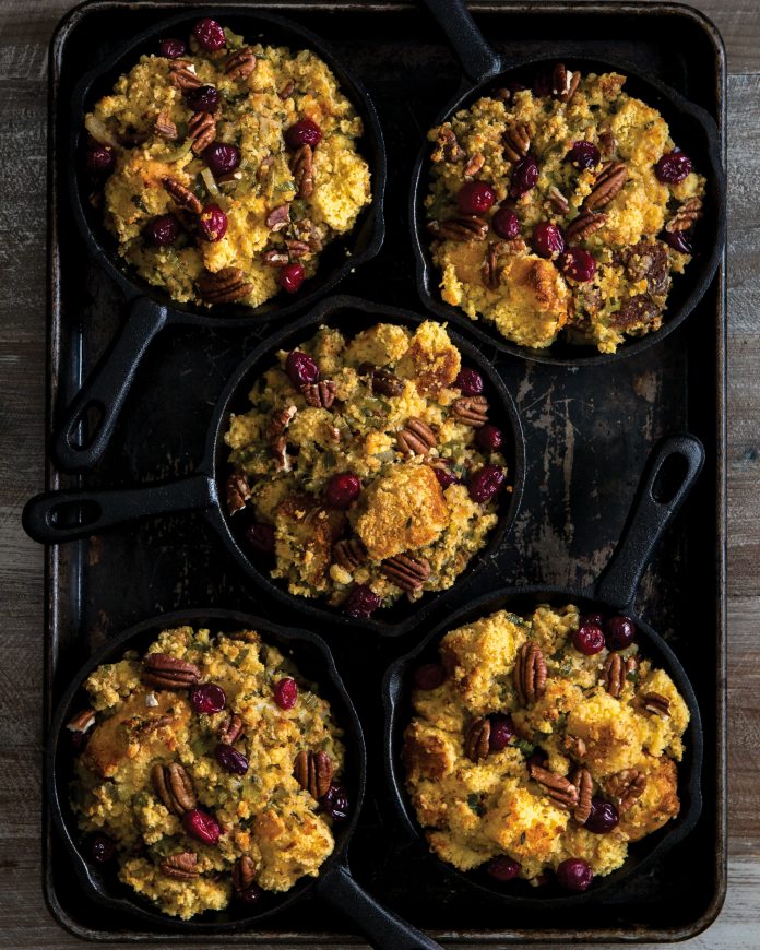 - In a large bowl, stir together leek mixture, cornbread, broth, eggs, salt, pepper, and 1 cup cranberries until combined. Spoon mixture into prepared skillets. Top with remaining ½ cup cranberries and remaining ⅓ cup pecans.