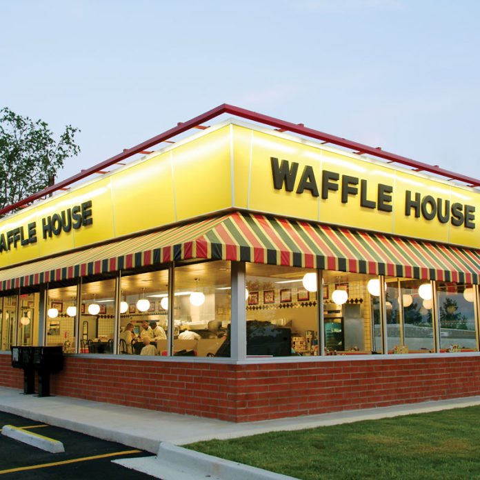 When I’m traveling, I feel a strong sense of immediate calm when I see a yellow Waffle House sign glowing in the distance. Scattered along America’s highways and byways, those big block letters are beacons, beckoning me in with their yellow light. Whenever and wherever I walk in, the sweet smell of batter envelops me, and I’m completely engulfed. The warm glow of the overhead globe lights shines down on the brown tile floors, and I’m welcomed by the sizzle of bacon and the clatter of pans—the comforting soundtrack of the open kitchen. Waffle House feels just like its name—it feels like you’re home.