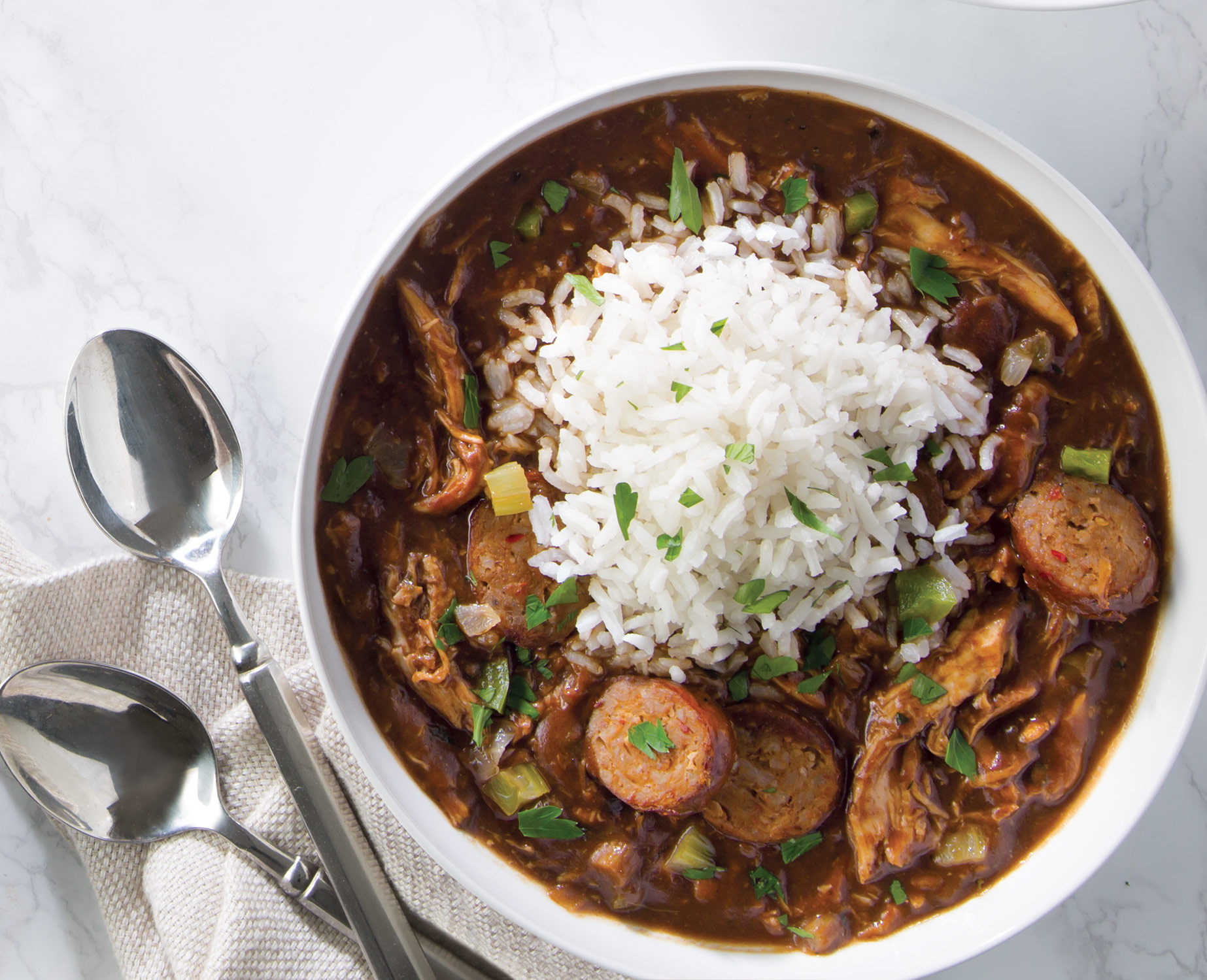 3. In a large bowl, whisk together dry roux and remaining 2 cups broth. Add roux mixture to pot with andouille; bring to a boil. Reduce heat to medium-low; simmer for 20 minutes, adding chicken during last 5 minutes of cooking time. Discard bay leaf. Season to taste with salt and pepper. Stir in filé powder. Serve immediately with rice. Garnish with parsley, if desired.