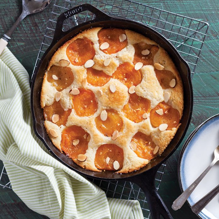 Deliciously dense, this cake-like batter rises to enfold the tender apricots. Canned apricots can be substituted for fresh apricots.