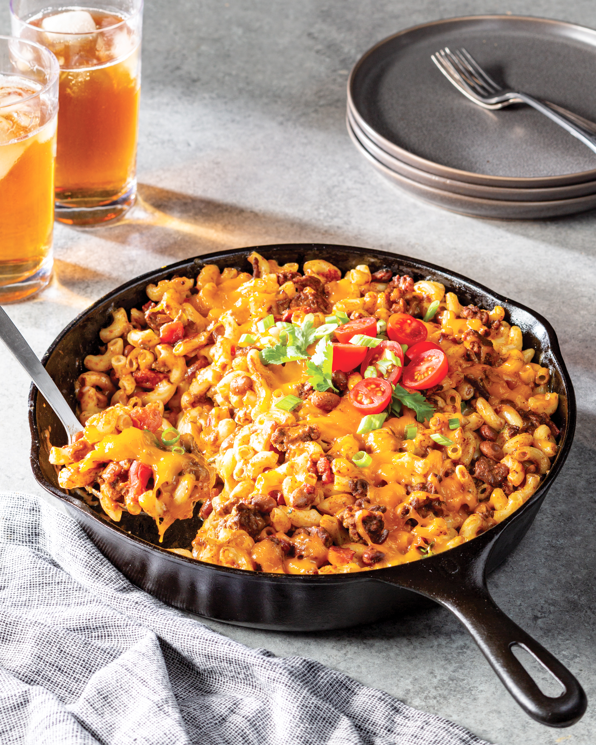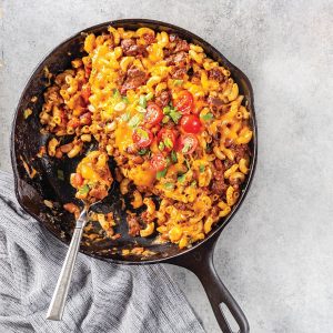 Creamy mac and cheese meets the spicy flavors of chili in this hearty, comforting casserole.