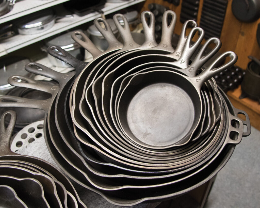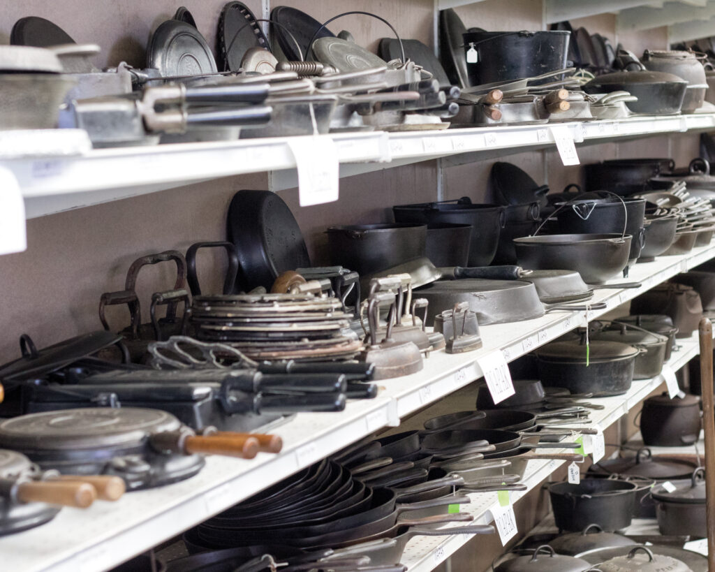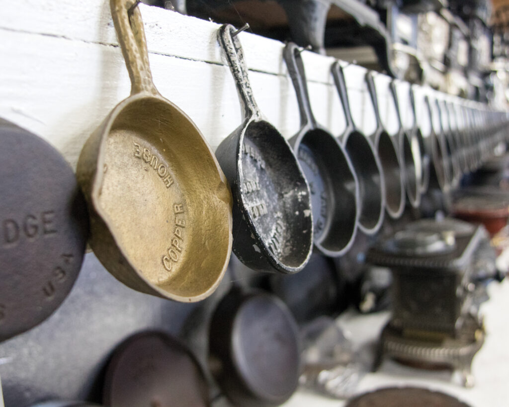 Mary: Like most collectors, Larry started small. When he was younger, Larry asked his mother if he could have the two cast-iron skillets hanging on her kitchen wall. She’d already promised them to his sister, but Larry was smitten with the pieces, so he set out to get his own. He found a Griswold and a Wagner skillet for $8 at a thrift store, and the spark had been lit. Larry’s two pans became a collection—and the collection became a museum. And we were just seeing the tip of the iceberg.