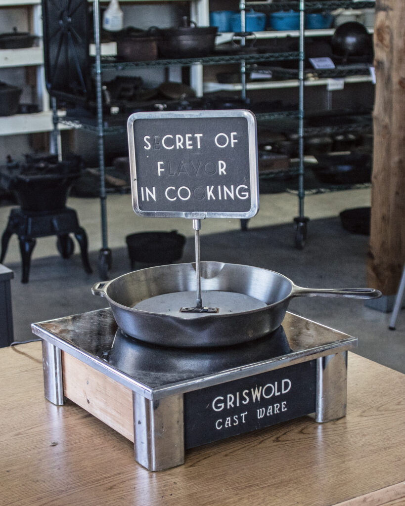 Mary: At the end of our museum tour, Larry had a surprise to show us—a rare 1940s Griswold store display. From a wooden box marked “Property of the Griswold Mfg. Co.,” Larry carefully removed an old Griswold salesman’s attaché case. From the case, he took a square base with an attached sign marked “Griswold Cast Ware” and a sample skillet, and placed the skillet on the base. Marg plugged the cord into a power outlet, and we all stood silently as the Griswold skillet turned round and round displaying its simple beauty.