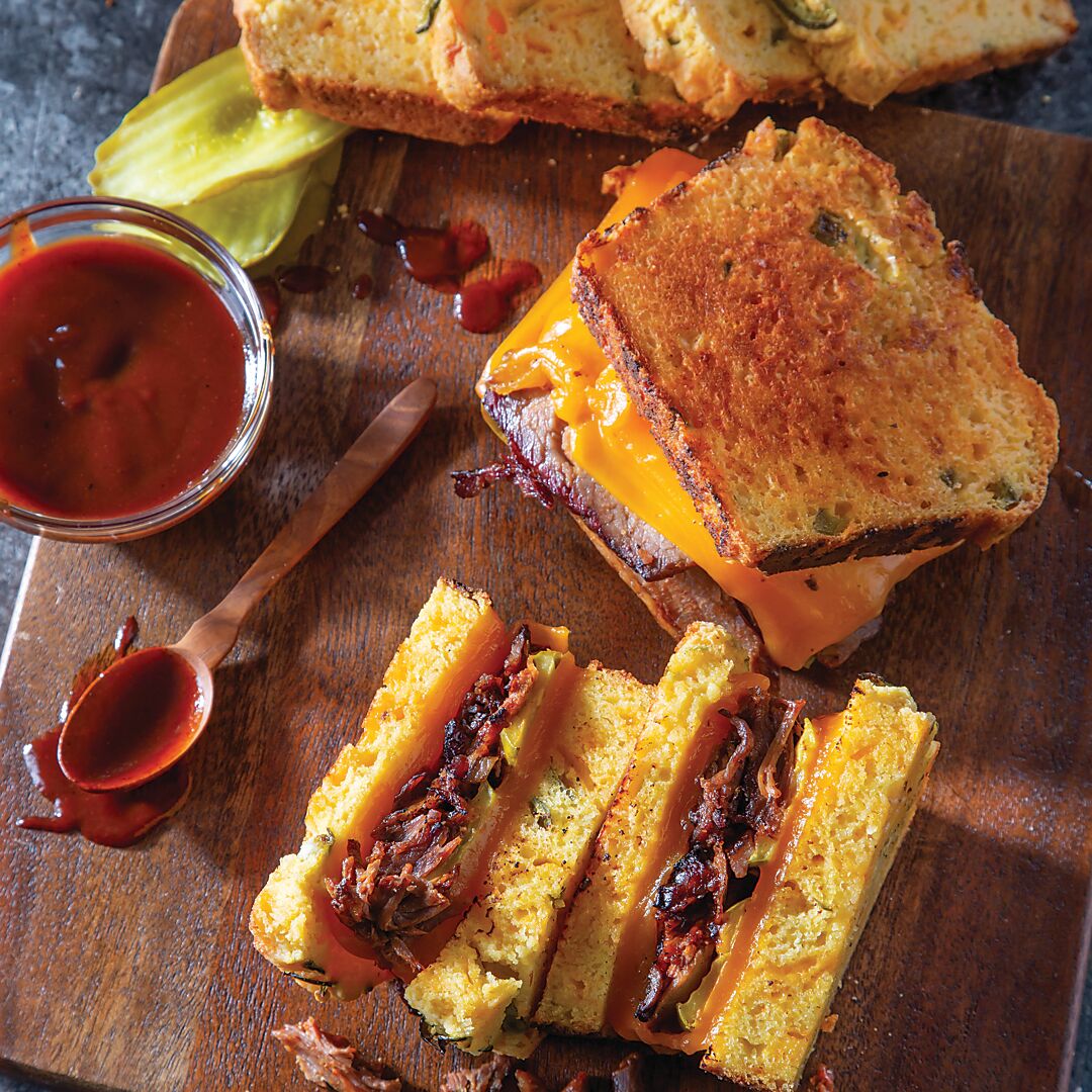 - Spread a thin layer of barbecue sauce onto 4 slices Jalapeño-Cheddar Cornbread; top each with 2 slices cheese and one-fourth of brisket. Drizzle barbecue sauce onto brisket; top each with pickles, 2 slices cheese, and remaining slices of cornbread.
