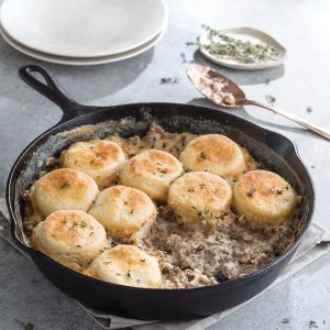 Make your mornings easy with this one-skillet meal of two Southern favorites. The biscuits can even be made ahead of time so all you have to do is pop them on the gravy before baking.