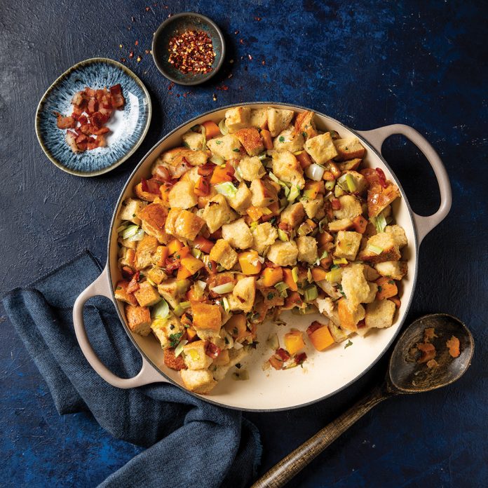 Cubed sourdough bread gives great texture to this winter squash- and leek-packed dressing.