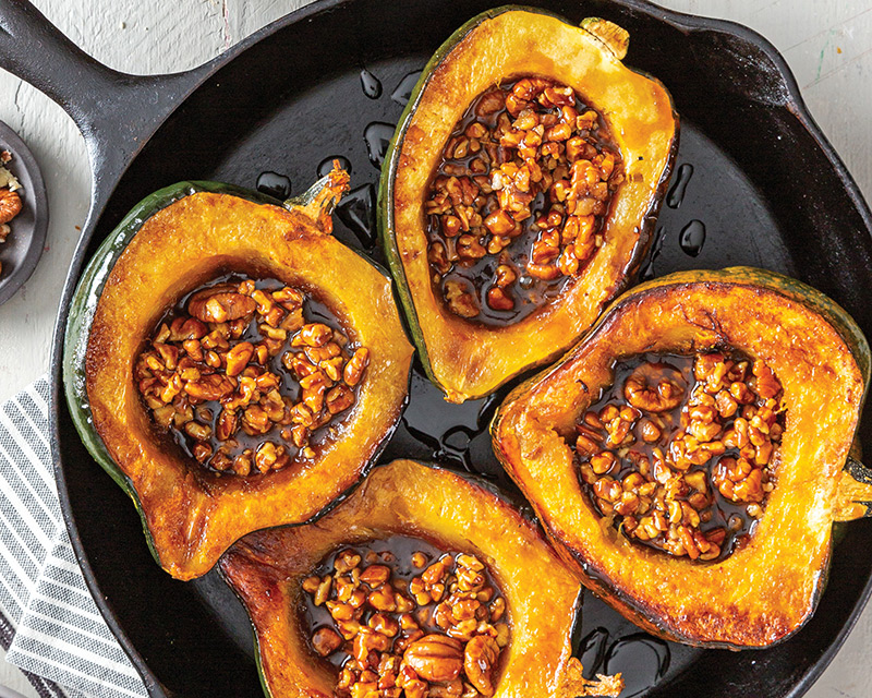 - Turn squash cut side up; brush with syrup mixture. Stir pecans into remaining syrup mixture; spoon into squash halves.