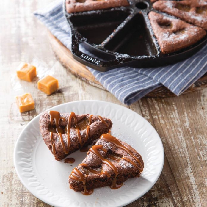 - In a large bowl, whisk together 1 cup sugar, flour, cocoa, salt, and baking powder. Stir in melted butter, vanilla, and eggs until moistened. Scoop batter into prepared wedges, spreading evenly. Place 2 caramel halves on each wedge.
