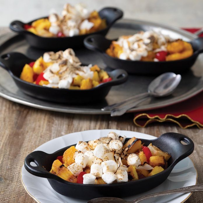 Grilling the fruit and toasting the marshmallows and coconut update this old-fashioned Southern holiday staple.