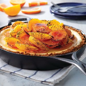 You can also use a handheld kitchen torch to caramelize the citrus topping. For neat and even cheesecake slices, dip the blade of your knife into hot water and dry it between each cut.