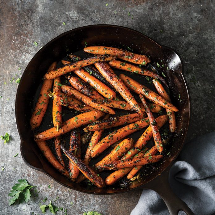 - In a large cast-iron skillet, melt butter over medium-high heat. Add carrots, garlic, salt, pepper, and cardamom; cover and cook, stirring occasionally, until charred and tender, about 15 minutes. Stir in parsley. Garnish with additional parsley, if desired.