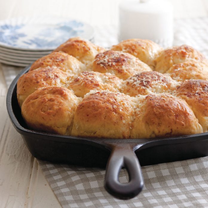 These giant cheesy yeast rolls are deliciously soft and fluffy. If you prefer a more traditionally sized dinner roll, split the dough into 24 to 26 pieces and bake in a 13×9 baking dish.