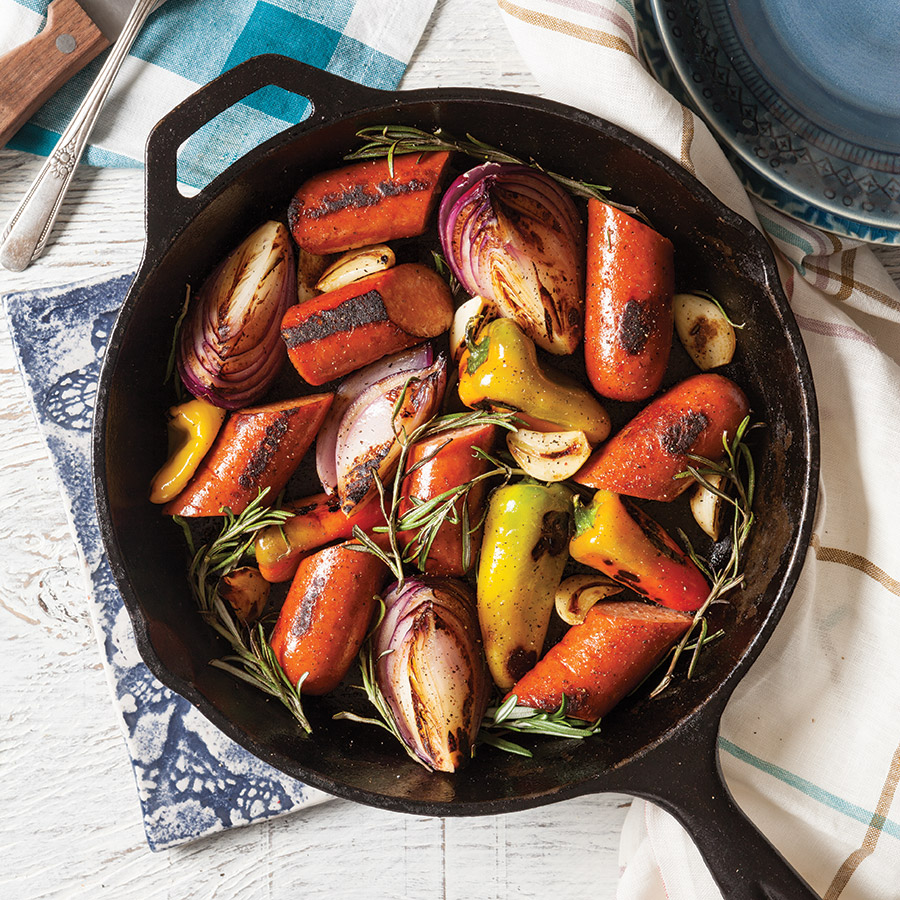 - Add sausage, sweet peppers, red onion, garlic, rosemary, salt, and black pepper. Grill, covered, until sausage and vegetables begin to char, about 10 minutes. Turn sausage and vegetables; grill, covered, until a meat thermometer inserted in thickest portion of sausage registers 165°, about 10 minutes more.