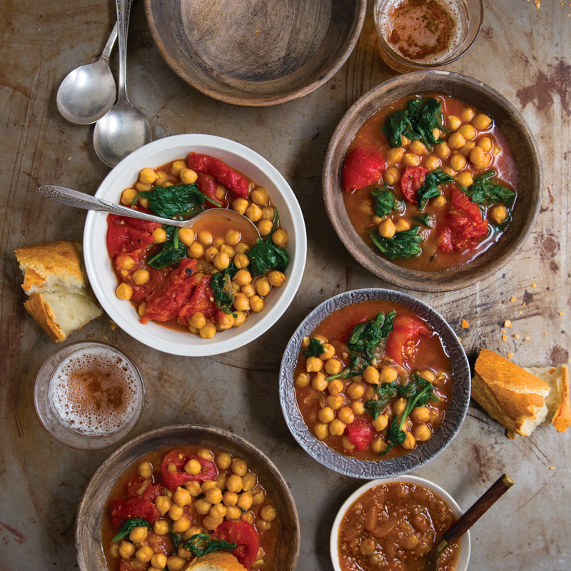 - Bake, uncovered, stirring once, until chickpeas are tender, about 1 hour. Remove from oven. Add spinach in batches, stirring until wilted. Garnish with ground black pepper. Serve with peach chutney and French bread, if des