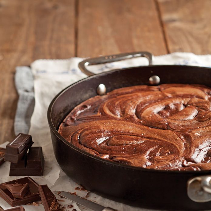 - In a large bowl, beat butter and sugar at high speed with an electric mixer until light and fluffy. Add eggs and vanilla, mixing to combine. Add melted chocolate, stirring to combine. Add flour, baking soda, and sour cream; mix just until combined. Pour batter into a 12-inch cast-iron skillet.