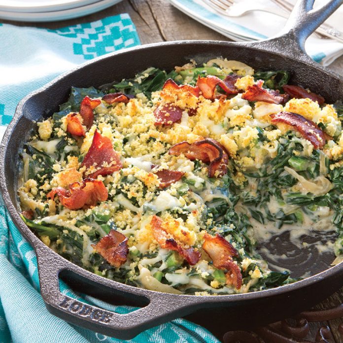 - Add onion and garlic to skillet. Cook, stirring occasionally, until golden brown, about 15 minutes. Stir in flour; cook for 1 minute. Gradually stir in milk; cook, stirring constantly, until thickened, about 5 minutes. Add 3⁄4 cup cheese, salt, mustard, and red pepper. Add collard greens, stirring until combined. Top with bacon, cornbread, and remaining 1⁄4 cup cheese.