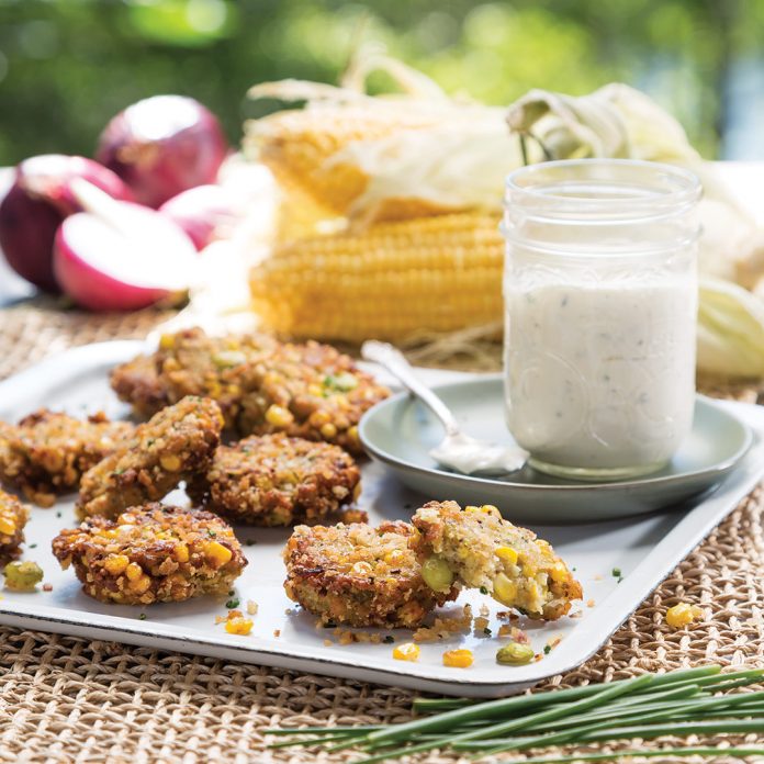 - In a medium bowl, combine corn mixture, bean puree, 1¼ cups bread crumbs, eggs, thyme, chives, salt, pepper, and remaining ¼ cup lima beans. Gently shape mixture into 2-inch patties (about 2 tablespoons each), and refrigerate for 20 minutes.