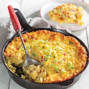 - In a large bowl, whisk together flour, cornmeal, baking powder, salt, and pepper. Whisk in puréed corn, eggs, sour cream, and butter until smooth. Stir in 1½ cups cheese, pimientos, and green onion. Carefully spread mixture into hot skillet.