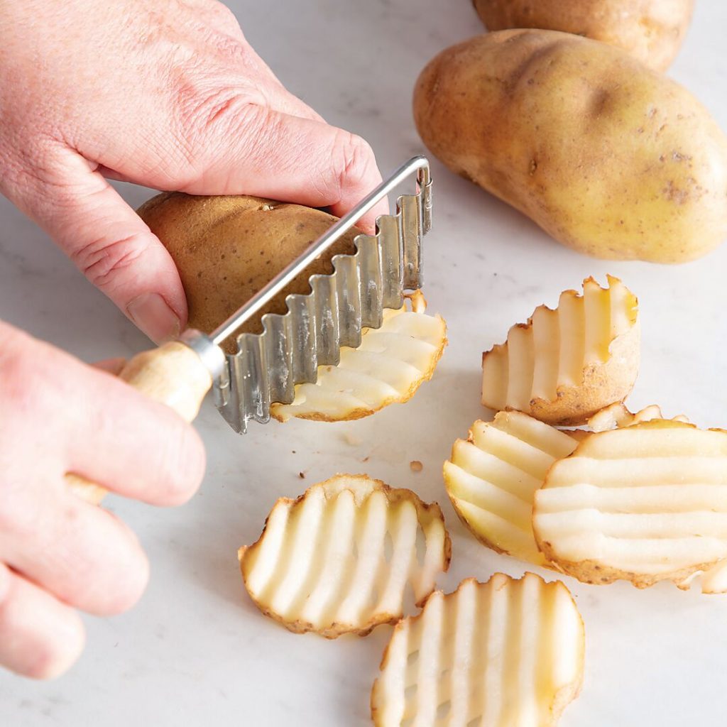 For crinkle-cut fries, simply slice potatoes vertically with a crinkle cutter, also called a wavy chopper or serrated slicer. For waffle fries, after making one vertical slice, rotate the potato 90°, and make another vertical slice. You can find many styles of crinkle-cutting tools on amazon.com for less than $10.