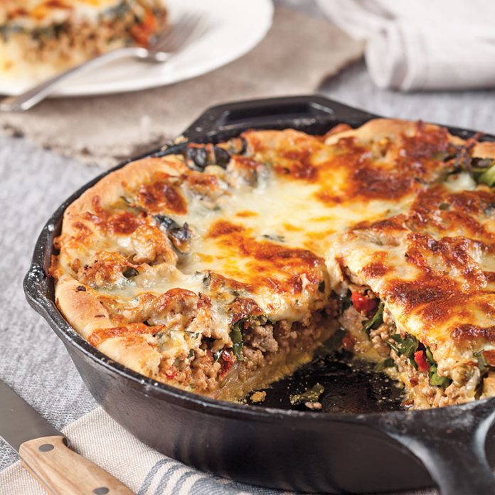 5. Lightly punch down dough. Cover, and let stand 5 minutes. On a lightly floured surface, roll dough into a 13-inch circle. Fold dough into quarters; place in prepared skillet. Unfold dough; lightly press into bottom and up sides of skillet. Add pork mixture; sprinkle with remaining 1 cup Cheddar and mozzarella.