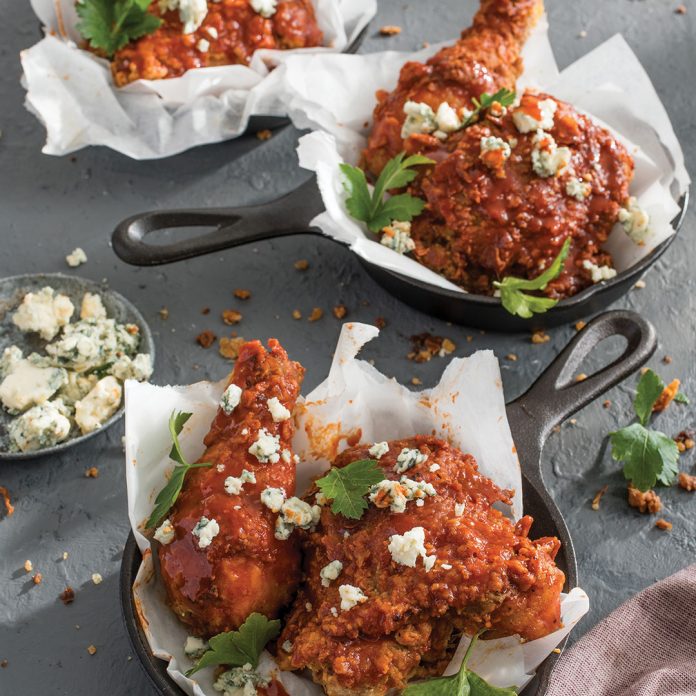- Remove chicken using tongs, and let drain on paper towels. Toss hot chicken in Dirty Sauce to coat. Garnish with blue cheese and parsley, if desired.
