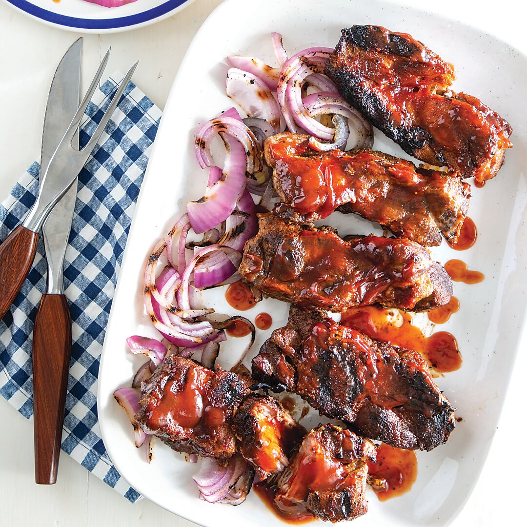 6. Gently remove ribs and onion from skillet. Wipe skillet clean. Cut remaining onion into ¼-inch-thick wedges.