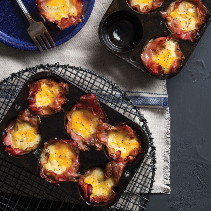 2. Brush wells of 2 (6-cup) cast-iron muffin pans with melted butter. Place 1 slice ham in each well, gently pressing into bottom and up sides.