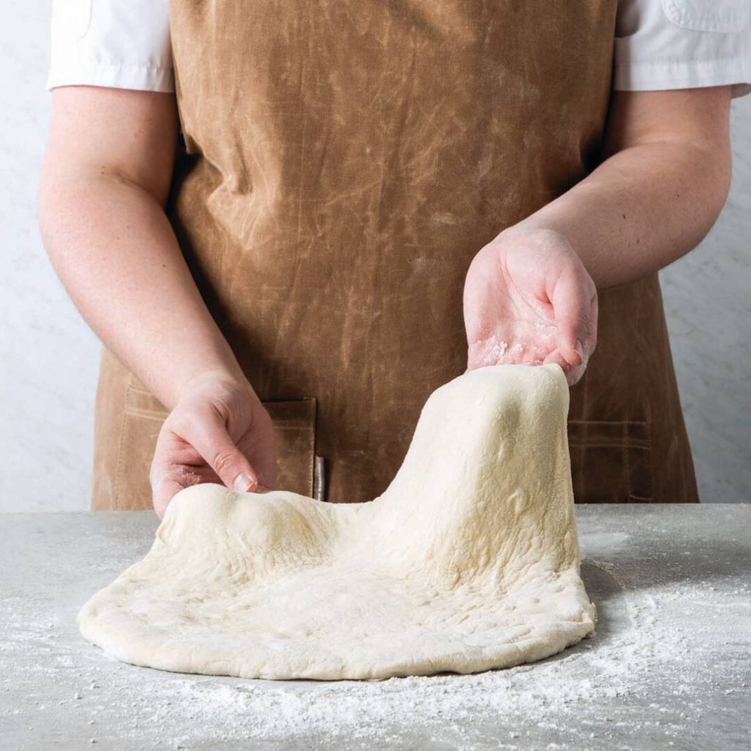 Rolling pizza dough smashes the air bubbles that were created when the dough was rising. This will create a flat, cardboardlike crust. Gently stretching your dough by hand will keep that air intact, creating a chewy crust that puffs in the oven. Place the risen dough on a lightly floured surface, and with floured hands, hold the edge of the dough and pull gently from the center. Alternately, form your hands in fists, drape the dough over your fists, and gently pull the dough out from the center. Rotate the dough as you stretch until you’ve reached your desired size.