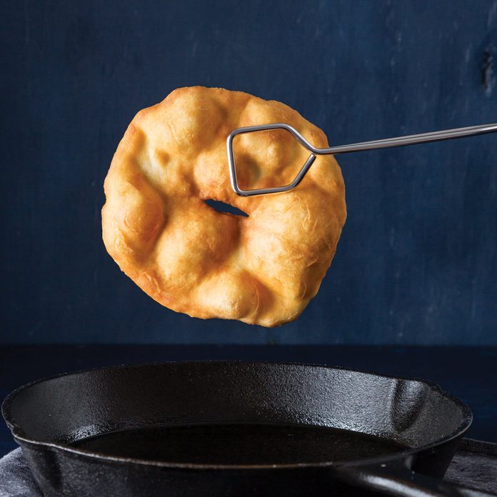 - Divide dough into 8 equal pieces, and roll each piece into a 6-inch round. Using a knife, cut a small slit in center of each round. (This ensures the bread fries evenly.) Working in batches, fry until golden brown, about 2 minutes per side. Let drain on paper towels. Serve warm or at room temperature.