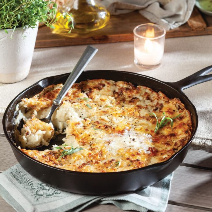 - Mash potatoes with a potato masher until desired consistency is reached; stir in butter, sour cream, cream, ½ cup Parmesan, tarragon, garlic, pepper, and remaining 2 teaspoons salt. Spoon potato mixture into a 10-inch cast-iron skillet. Top with remaining ½ cup Parmesan.