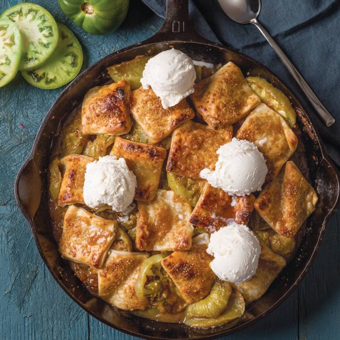 The use of green tomatoes in desserts emerged as an economical way for home cooks to give their families a treat, especially when apples were out of season. This simple and sweet pandowdy is our salute to those crafty cooks.