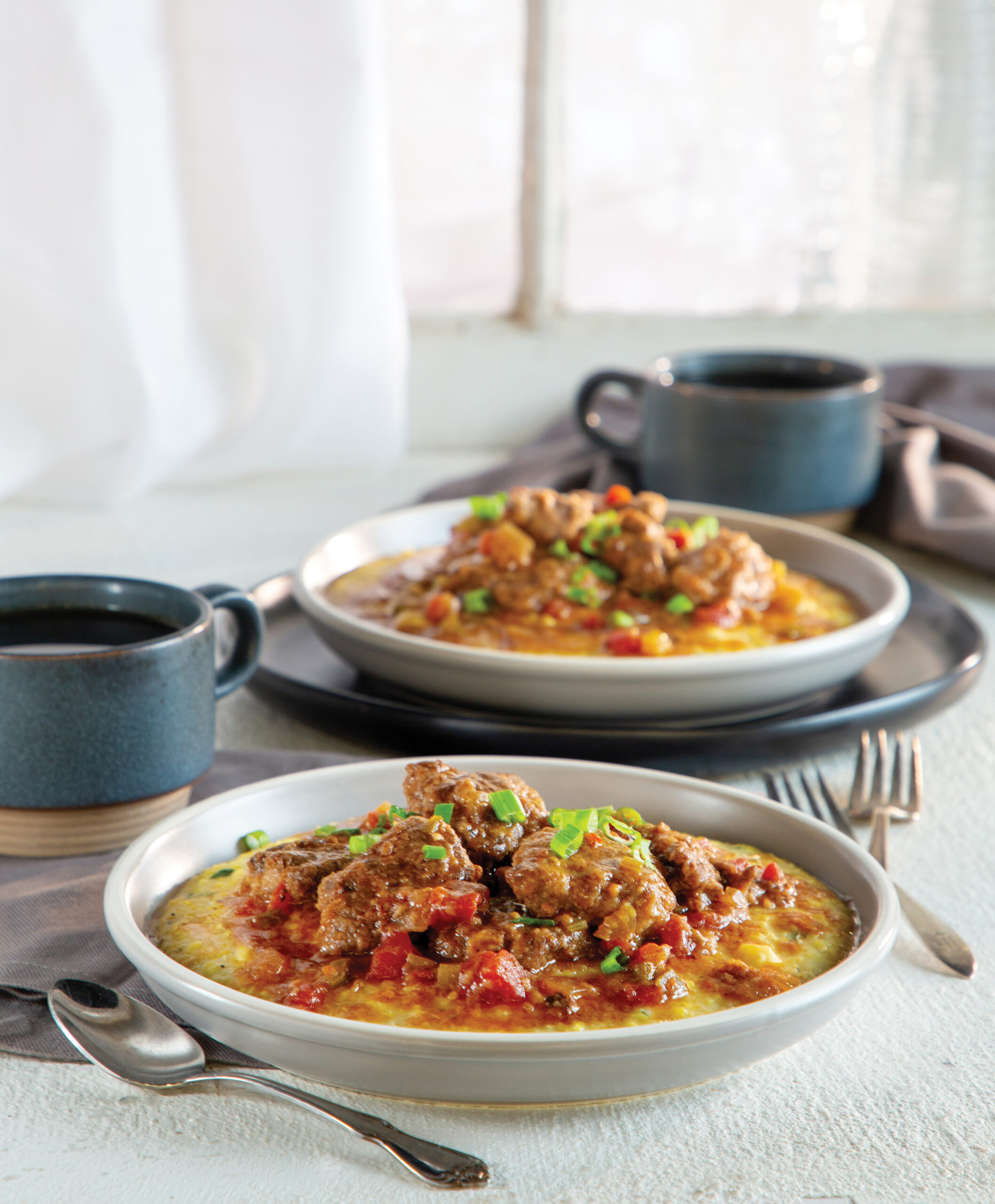 Tender beef smothered in a slow-roasted sauce and served on a bed of creamy grits—breakfast is better with grillades and grits.