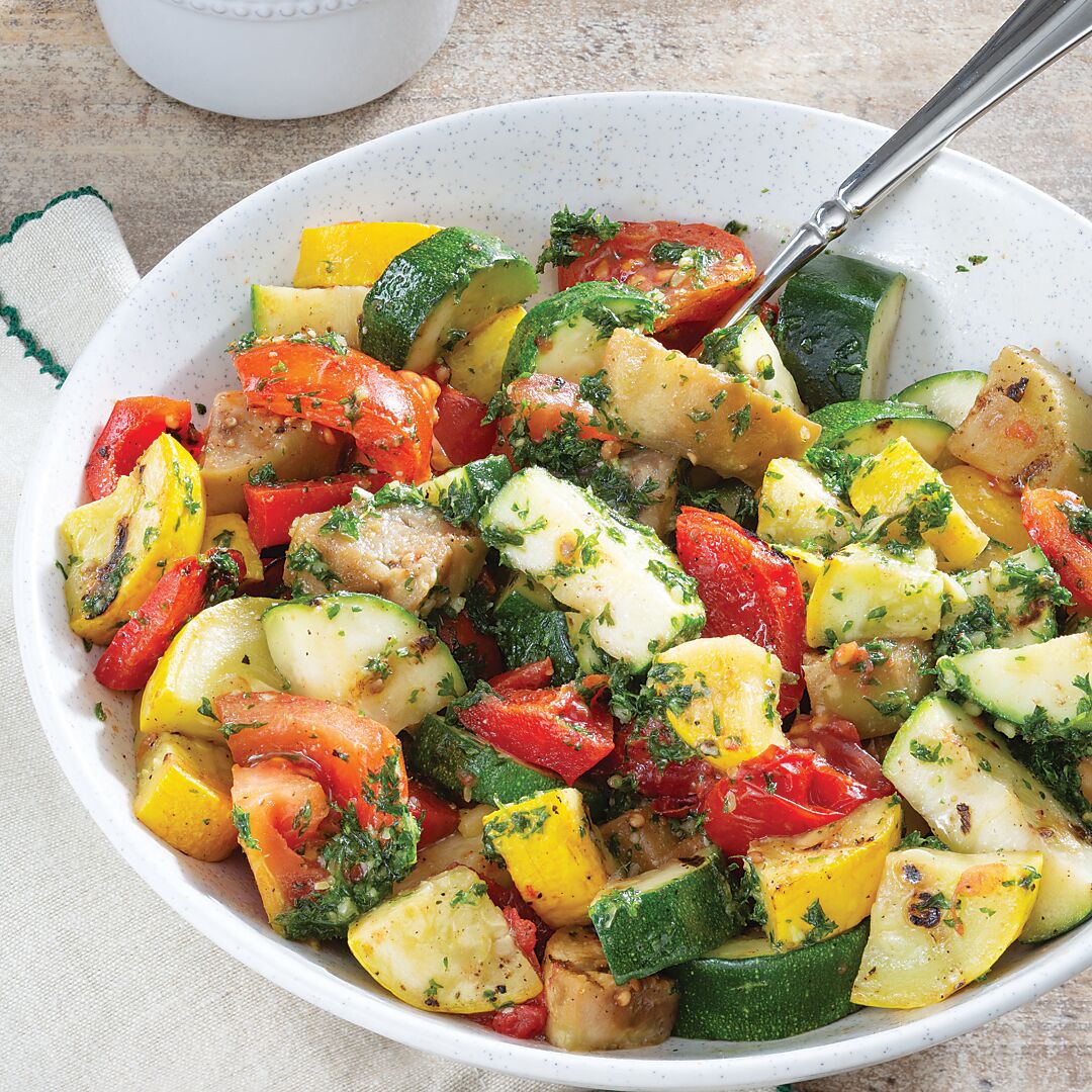 - Heat a cast-iron grill pan over medium-high heat. Grill vegetables in batches until lightly browned, 2 to 3 minutes per side. Cut vegetables into bite-size pieces.