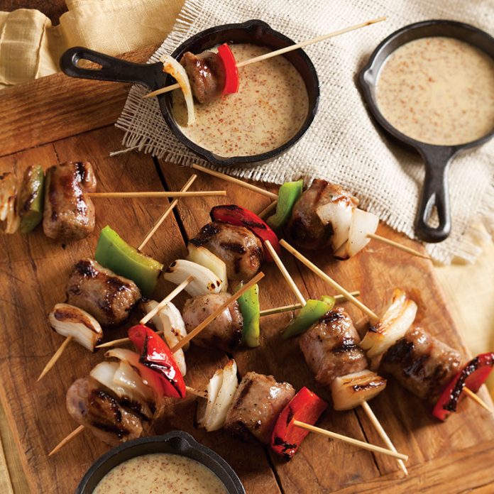 Grilled Sausage Skewers with Beer-Mustard Sauce