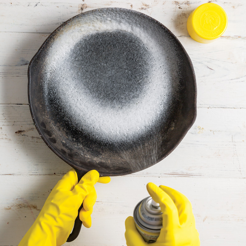 1. Wearing protective gloves, spray cast iron with oven cleaner. Spray it on thick and be sure to coat every surface. Be careful not to breathe in the fumes.