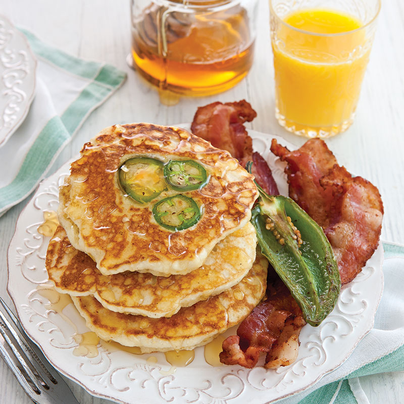 Drenched in honey, these cheesy cornmeal flapjacks make a filling supper when paired with a generous helping of skillet-crisp bacon. Not a fan of spicy foods? Replace the jalapeño with pieces of crumbled cooked bacon for a milder option.