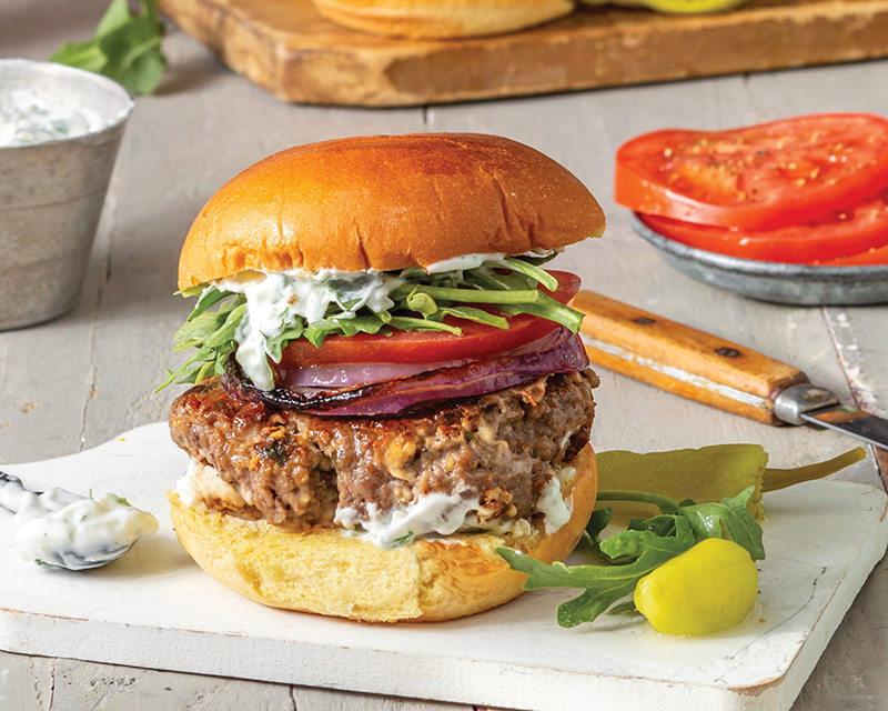 A juicy, flavorful lamb and beef patty is best accompanied by a generous dollop of cool and creamy tzatziki, which also doubles as a delicious dip for crackers and fresh veggies.