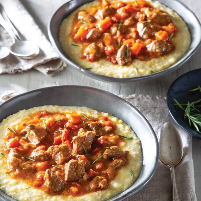 The unique flavor of lamb is complemented by rosemary and creamy fontina cheese grits in this down-home stew. If you aren’t a fan of lamb, cubed chuck roast can be substituted, though cooking time may increase by about 30 minutes.