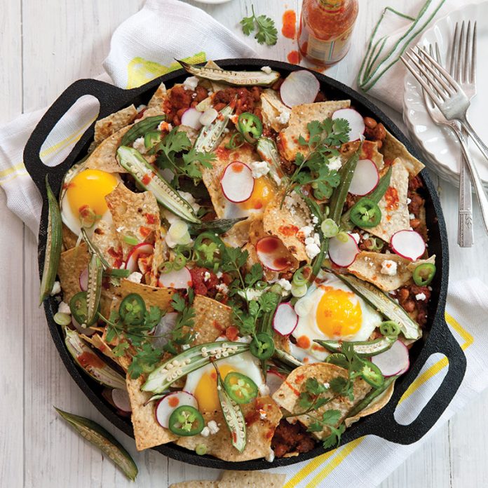 - Scatter chips on prepared pan. Top with chorizo mixture and okra. Crack eggs over nachos, spacing evenly.