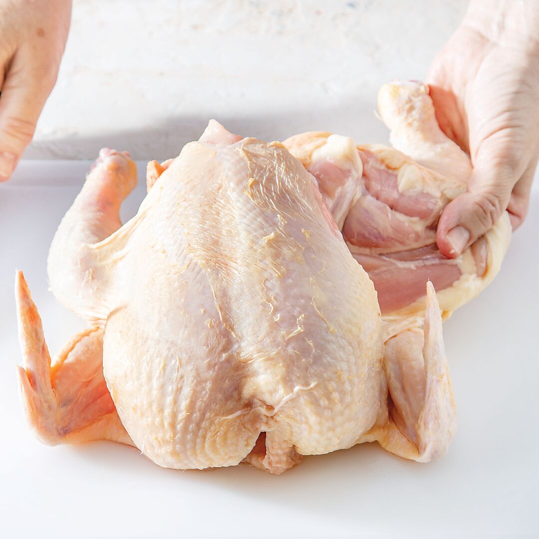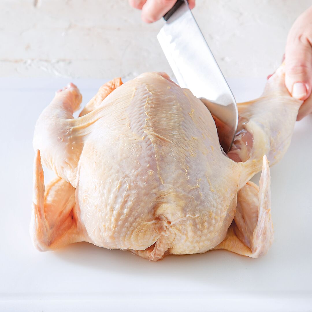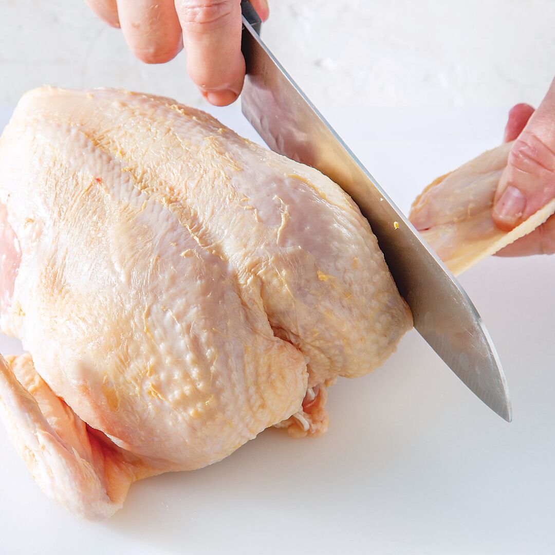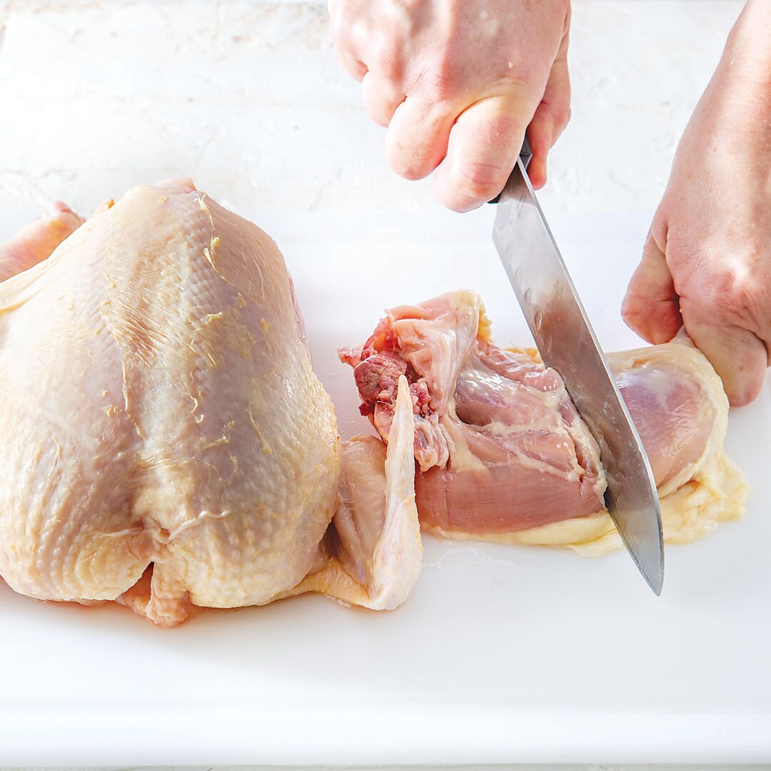 1. With the chicken breast side up, pull the leg away from the body and cut through the skin between the breast and the leg.