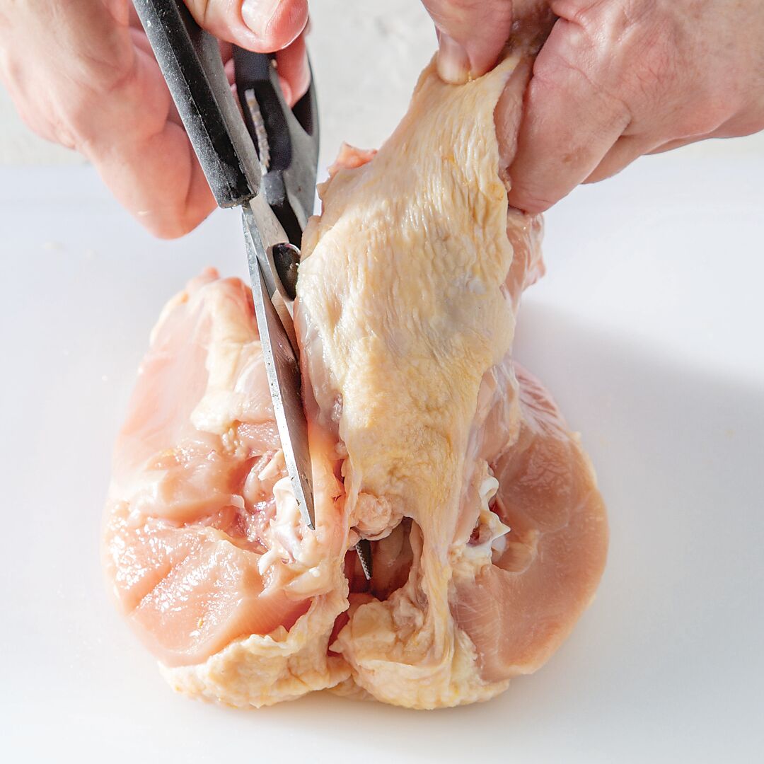 5. Turn the chicken breast side down and cut along both sides of the backbone to remove it. You can use a knife, but kitchen scissors make quick work of this part of the process. Save the backbone to make chicken stock.