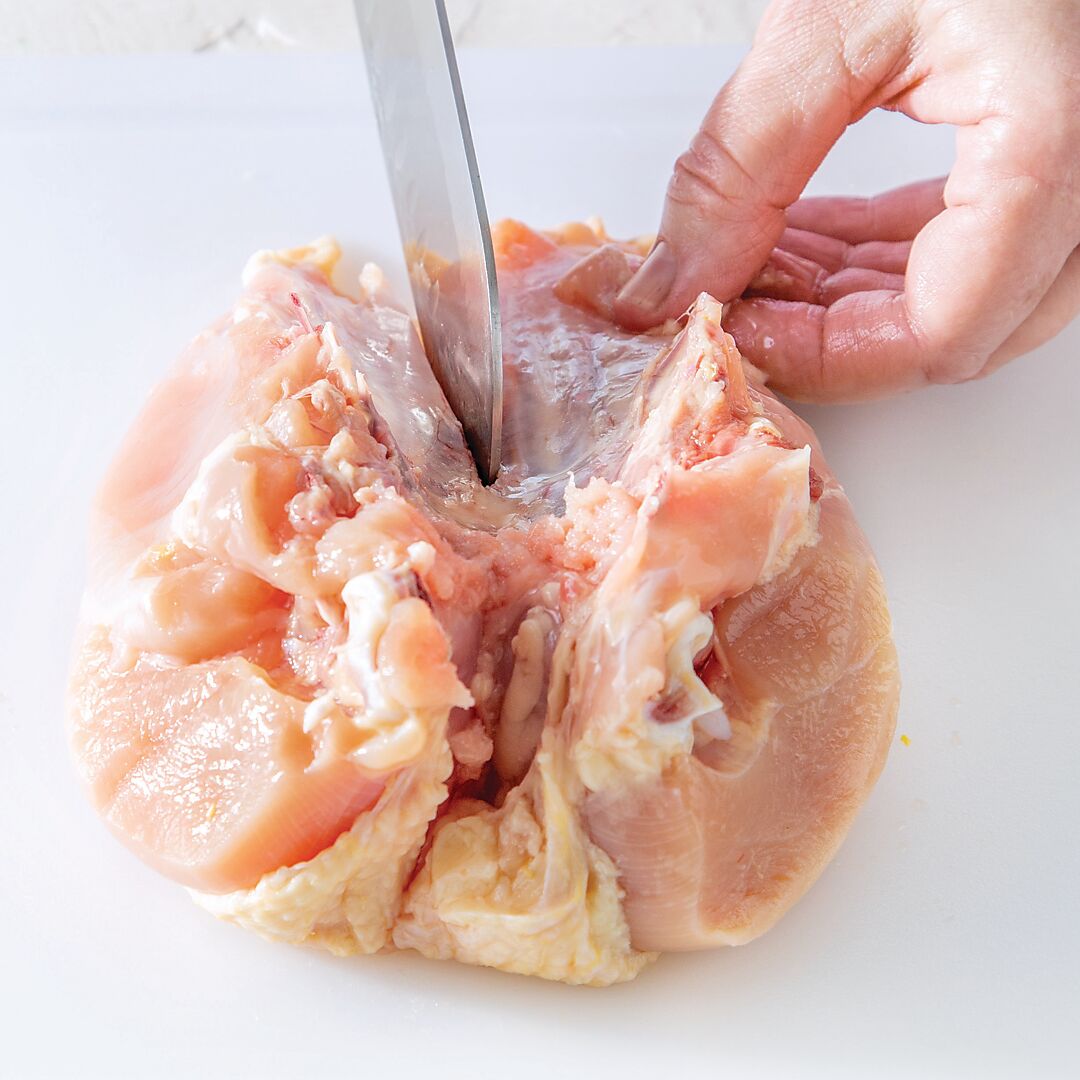 6. Cut through the center bone of the breast and then through the meat and skin to separate into two pieces. If the breasts are large, you can cut each in half crosswise to make smaller pieces for easier frying.