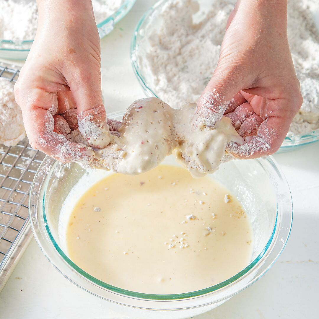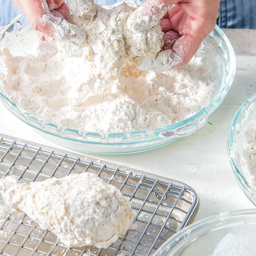 10. Dredge the dipped chicken in the salt-only flour mixture to fully coat; do not shake of excess flour. Let the chicken stand on a rack to help set the breading for a crunchy crust.