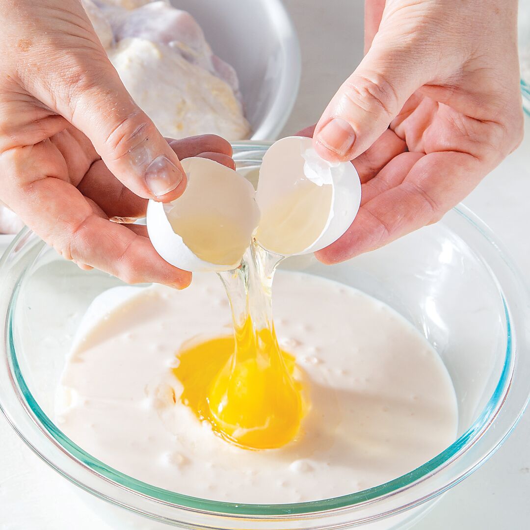 8. Create the flour mixtures. Remove the chicken from the buttermilk marinade; whisk eggs into reserved buttermilk mixture.