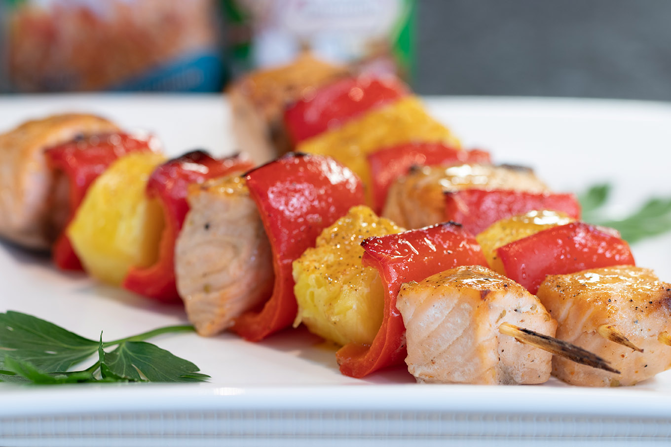 - Using two skewers side-by-side and an inch apart, thread salmon, red bell pepper, pineapple and repeat. Continue alternating ingredients to fill skewers.