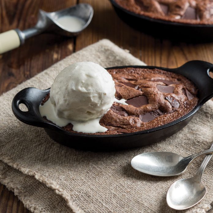Yes, you can bake the batter in a 10- or 12-inch skillet, but I can’t give you a precise bake time for this variation because we developed these to be individual servings. If you use one larger skillet, be sure to check the brownie periodically for doneness.