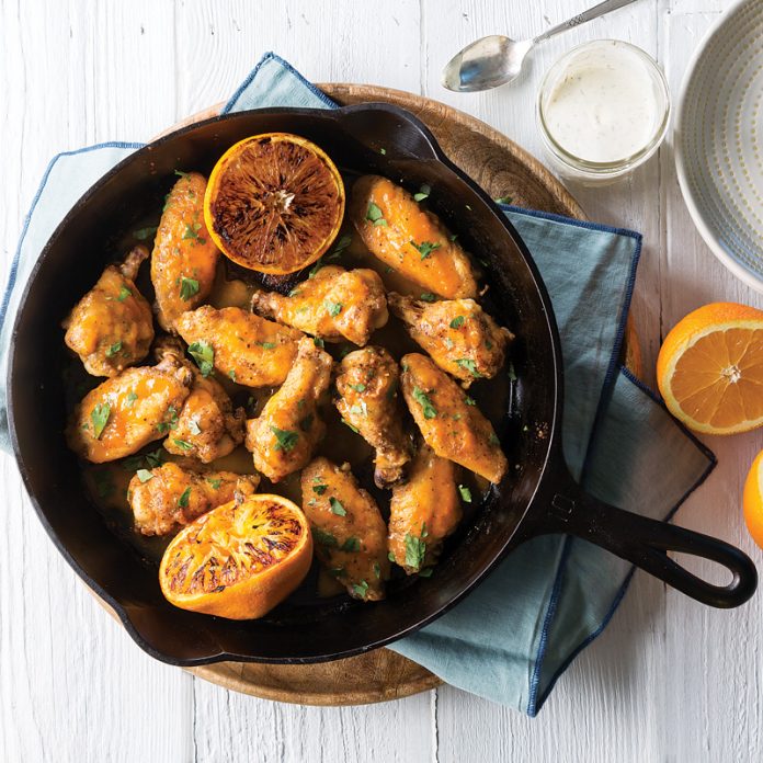 - In a large bowl, stir together salt, garlic powder, onion powder, and pepper. Add chicken wings, tossing to coat. Coat a 12-inch cast-iron skillet with oil. Arrange wings skin side up and orange halves cut side down in skillet in an even layer.