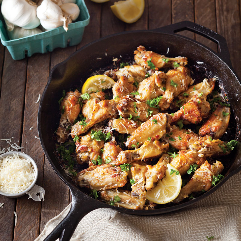 - In a 12-inch cast-iron skillet, stir together chicken, garlic, oil, salt, and peppers until combined. Spread into a single layer.