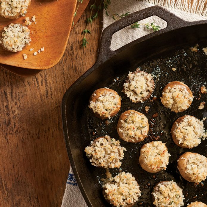 - In a small bowl, combine bread crumbs, cheese, thyme, garlic, salt, and pepper. Add 2 tablespoons melted butter; toss well. Spoon about 1½ teaspoons bread crumb mixture into each mushroom. Place mushrooms in skillet. Drizzle with remaining 2 tablespoons butter.